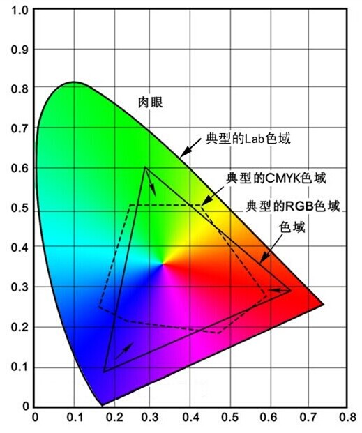 CMKY的色域小于RGB,但是CMYK中的某些颜色在RGB之外这也就告诉我们,某些打印、印刷的颜色在显示器上也不能正确反映。在RGB模式和CMYK模式两种颜色的色域中相当大的一部分是重合的,只有重合的部分才是显示器和打印机、印刷机所能表现的色域。
